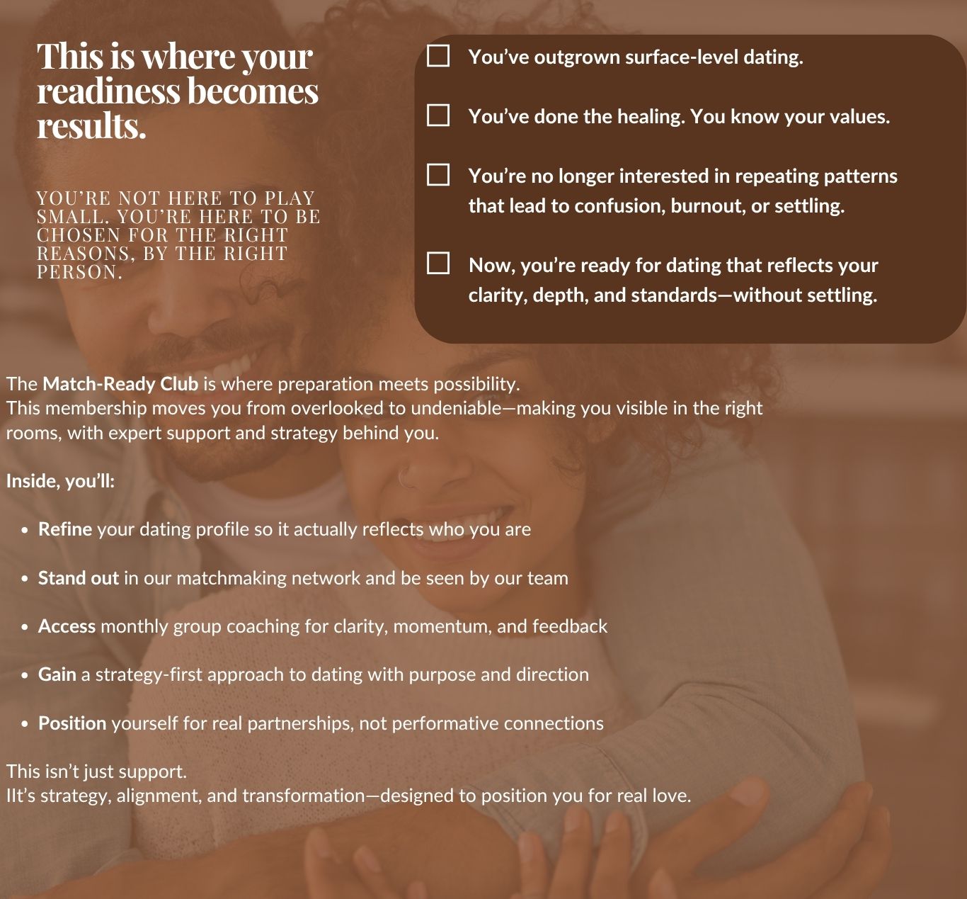 "“I’ve built a successful life, but dating felt frustrating and unfamiliar. Match-Ready gave me clarity, alignment, and purpose again.”