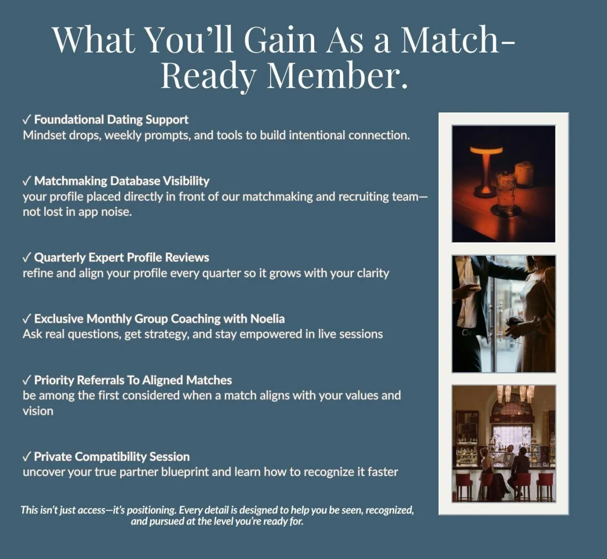 A monthly membership with strategy, support, and matchmaker visibility—designed so the right people actually see you… and pursue you.
